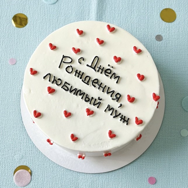 Лаконичный и трогательный торт на заказ с нежным кремовым покрытием и декоративными сердечками — идеальный выбор для поздравления любимого человека. Минималистичный дизайн и персональная надпись делают торт универсальным подарком ко дню рождения, годовщине или другому важному событию.