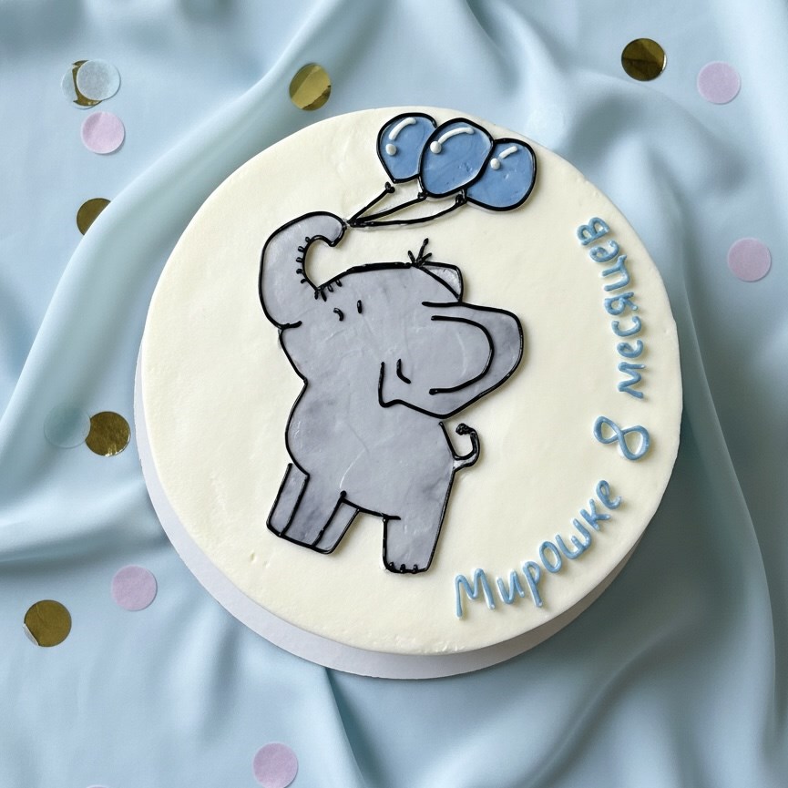 Мини-торт с трогательным слонёнком и воздушными шариками — идеальный способ отметить любую важную дату малыша.