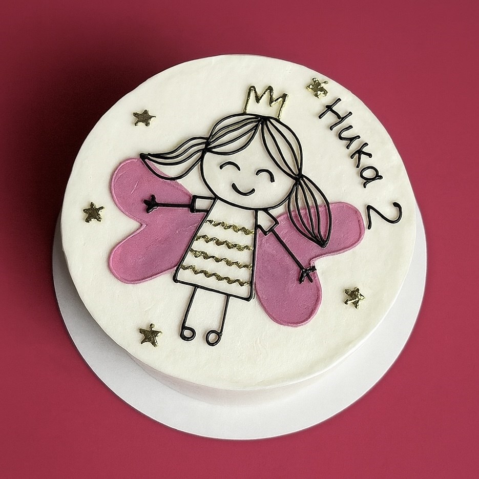 Белоснежный бисквитный торт украшен милым рисунком феи с розовыми крылышками, золотой короной и сияющими звёздочками. Украшение выполнено вручную с использованием безопасных пищевых красителей.