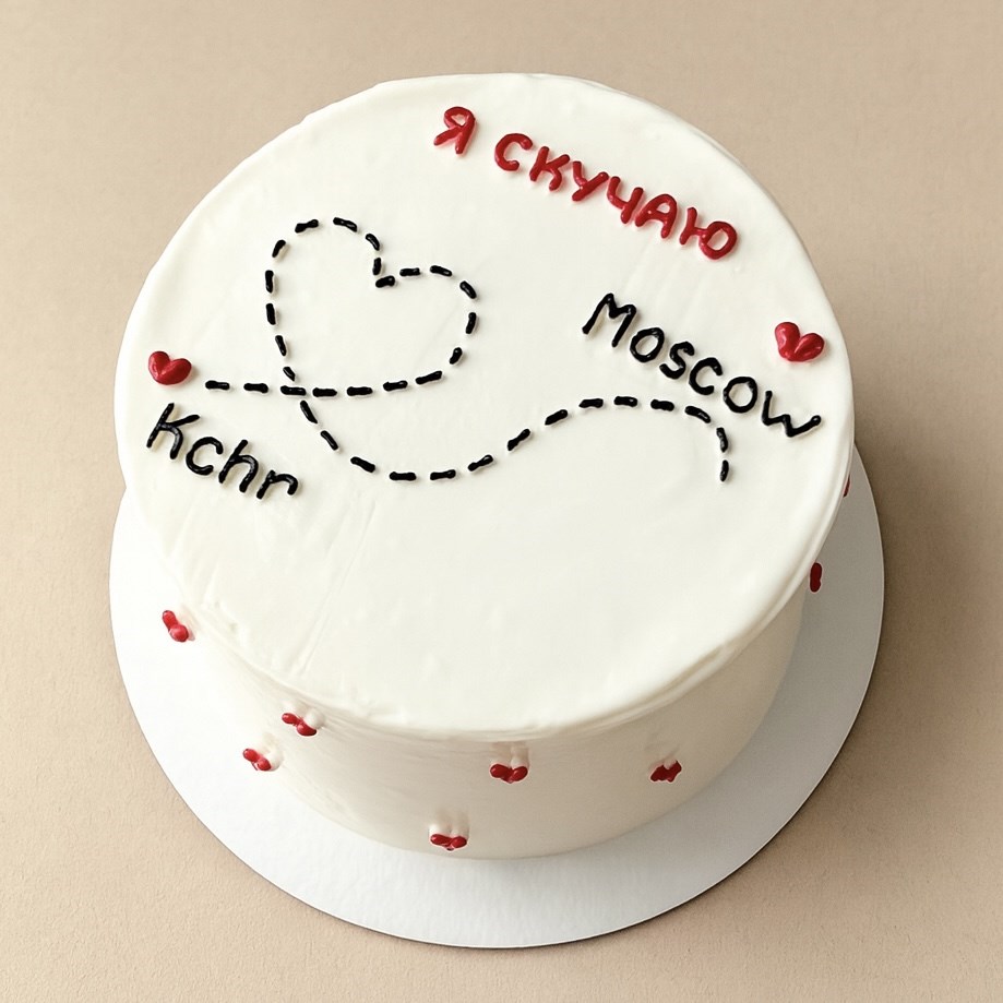 Нежный бенто торт с лаконичным дизайном и душевным посланием. Украшен надписью «Я скучаю», символическим маршрутом между городами и милыми сердечками — идеальный способ выразить чувства на расстоянии.
