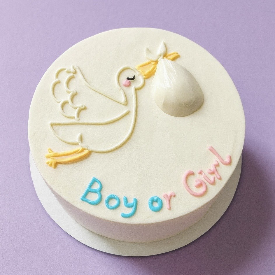 На торте изображён аист с узелком, а надпись “Boy or Girl” выполнена в голубом и розовом цветах. В комплекте идёт мешочек с цветным кремом (розовым или голубым), чтобы вы сами могли устроить мини-сюрприз.