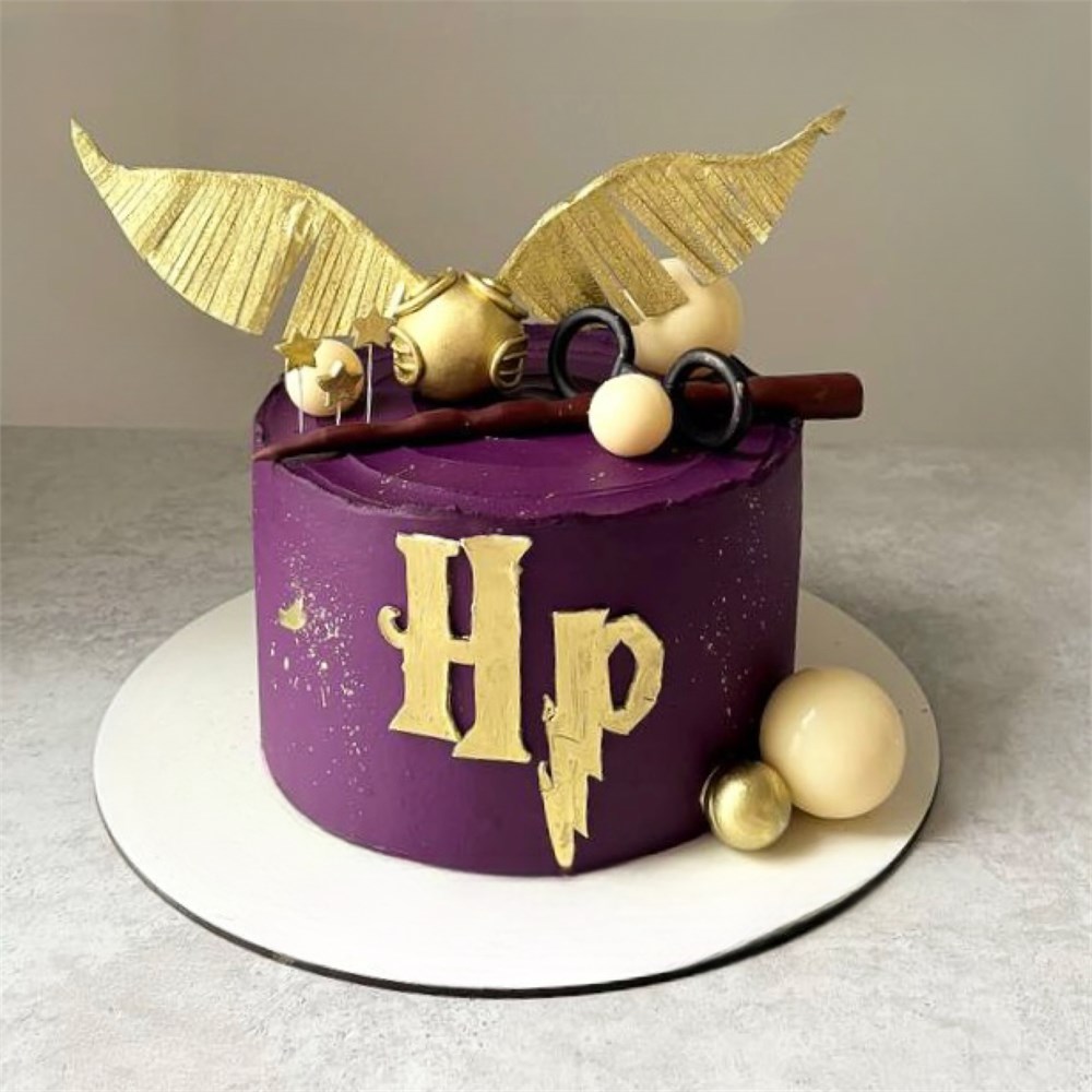Глубокий фиолетовый оттенок, золотые акценты и фирменный логотип “HP” делают этот торт настоящим украшением праздника. Съедобные декорации — золотой снитч, волшебная палочка и очки — добавляют реалистичности и чарующего настроения.