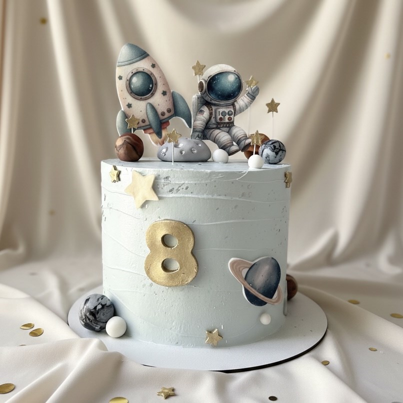 Торт на заказ с оригинальным космическим оформлением — идеальный выбор для детского праздника! Украшен акварельными топперами с изображениями ракеты, космонавта и планет. Объёмные звёзды и планеты из мастики создают эффект настоящей галактики. Дополняют композицию элегантные золотые акценты. Цветовая палитра — сдержанная и гармоничная, что делает торт не только вкусным, но и стильным украшением стола.