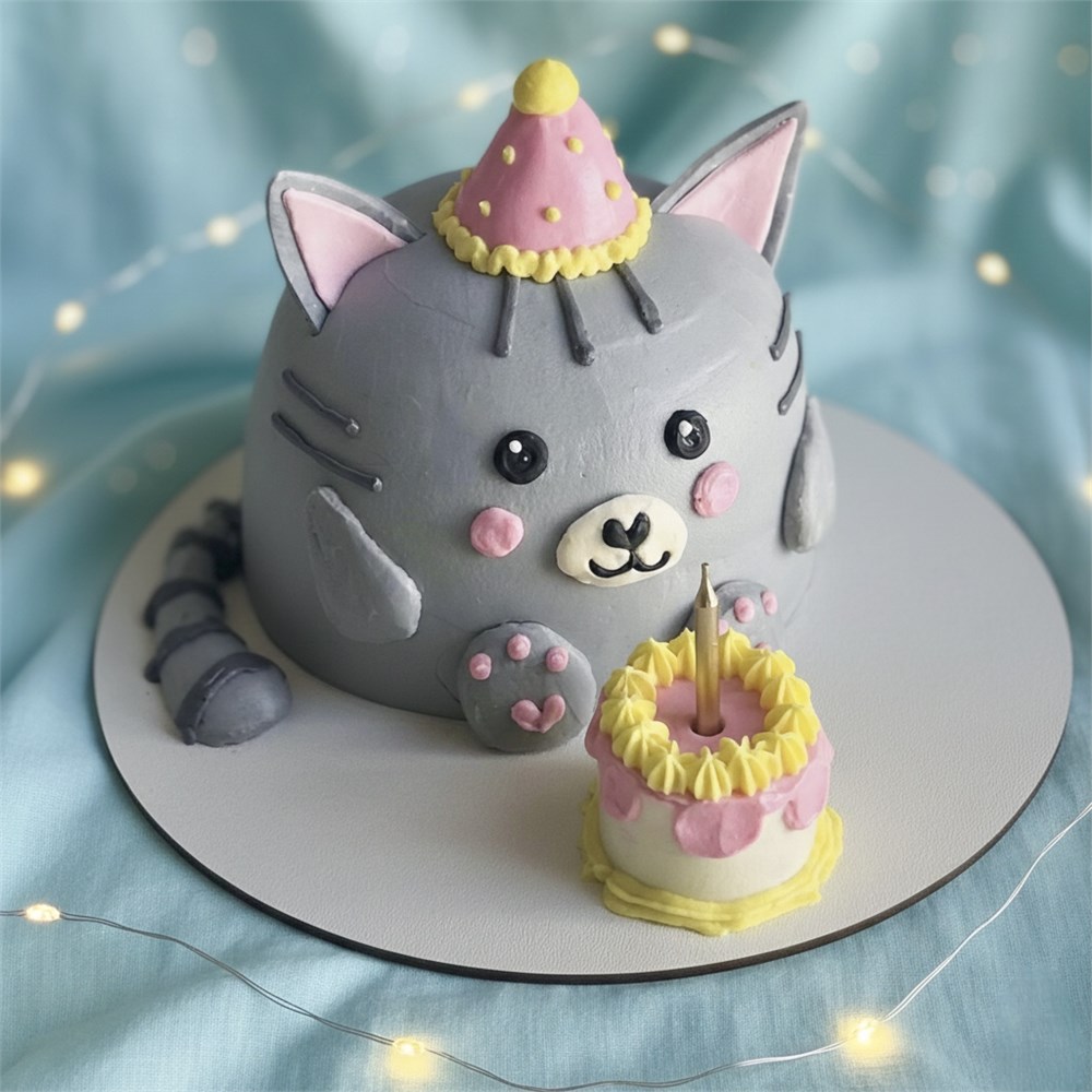 Очаровательный торт в виде котёнка с праздничным колпачком и мини-тортиком — настоящий хит для дня рождения ребёнка! Яркий, весёлый и очень вкусный 🎉