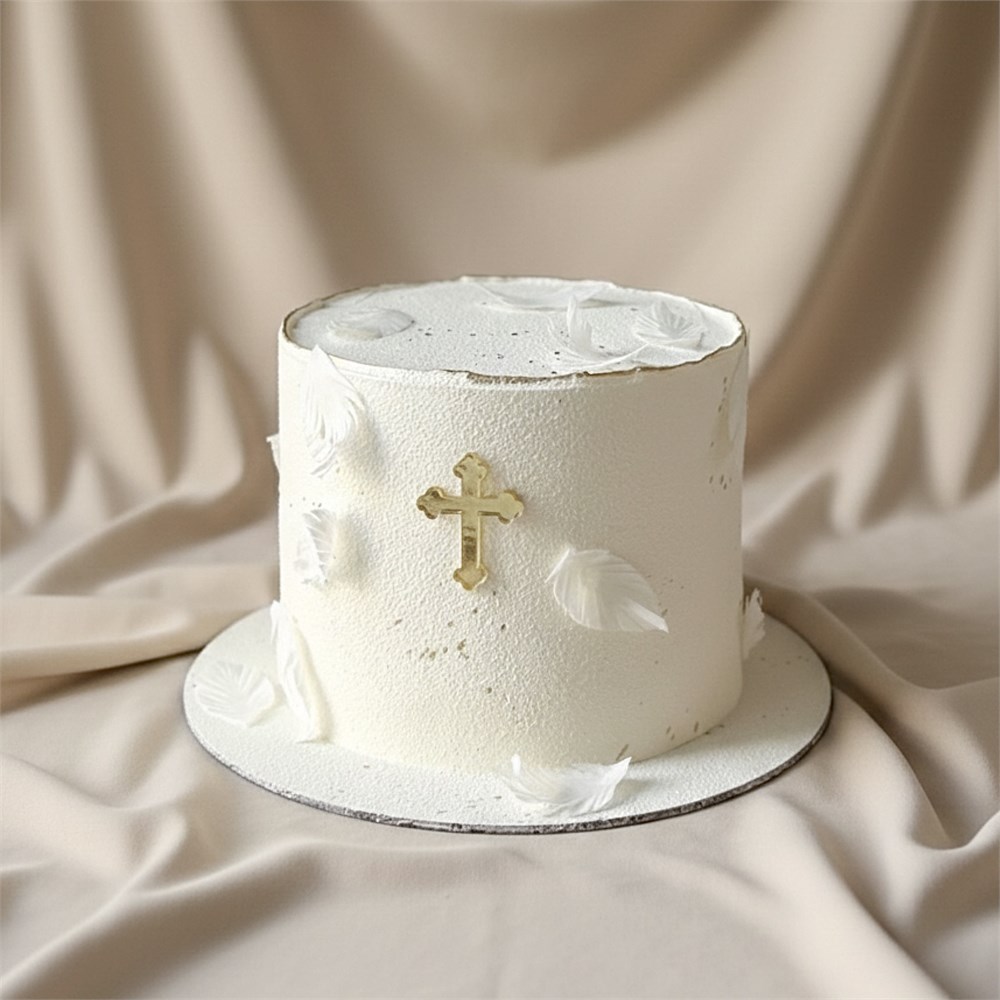 Изящный торт для крестин, оформленный в нежном белом цвете. Декорирован лёгкими перьями из вафельной бумаги и изысканным золотым крестиком, символизирующим светлый и торжественный момент. Покрытие - бархатный шоколадный велюр