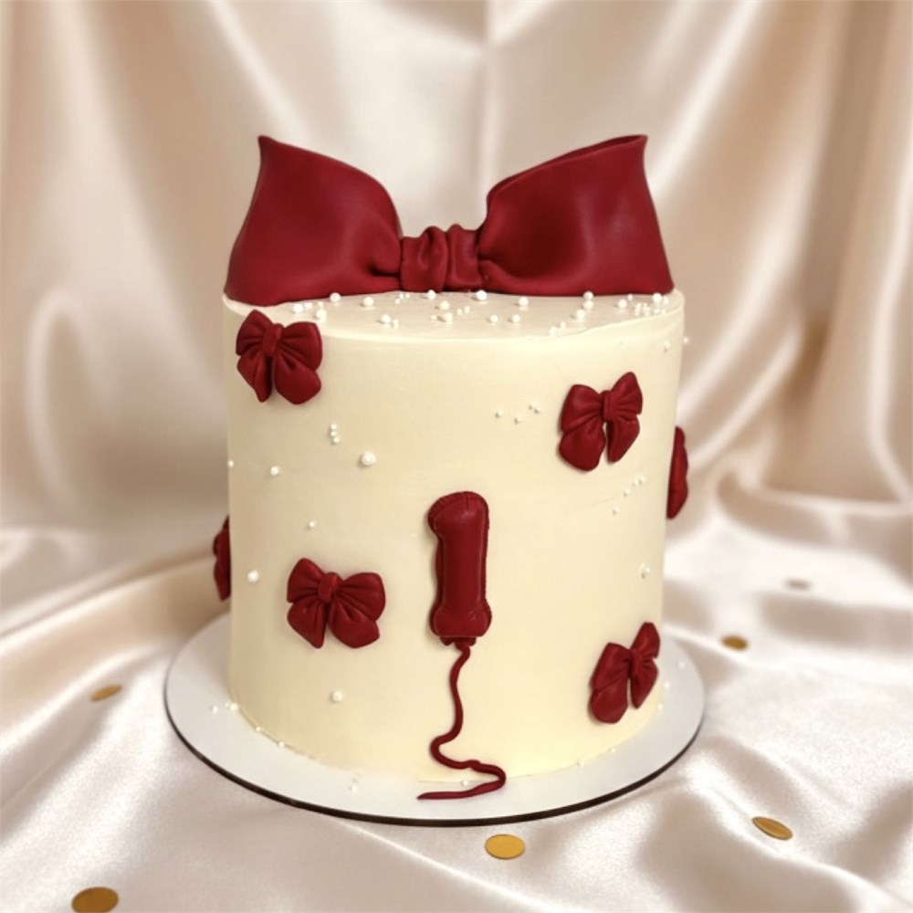 Нежный и стильный торт на заказ с лаконичным дизайном и яркими акцентами — идеальный вариант для первого дня рождения или детского праздника. Торт выполнен в светлой кремовой гамме и украшен декоративными бантиками глубокого бордового цвета, а также цифрой возраста. Такой дизайн выглядит аккуратно, празднично и отлично подходит для фотосессии.
