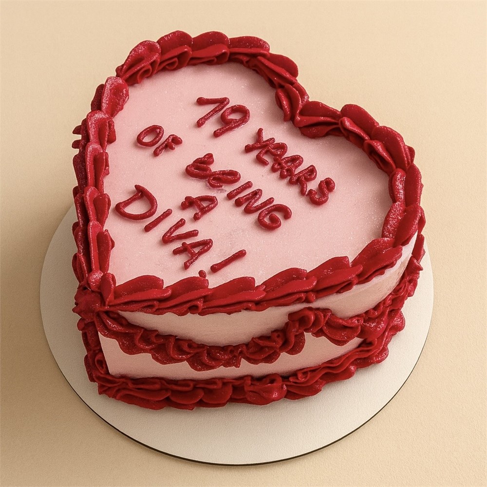 Украшен розовым кремом и яркими бордовыми рюшами с надписью “19 years of being a diva!” — этот торт станет главным украшением вашего стола и подчеркнёт настроение праздника.